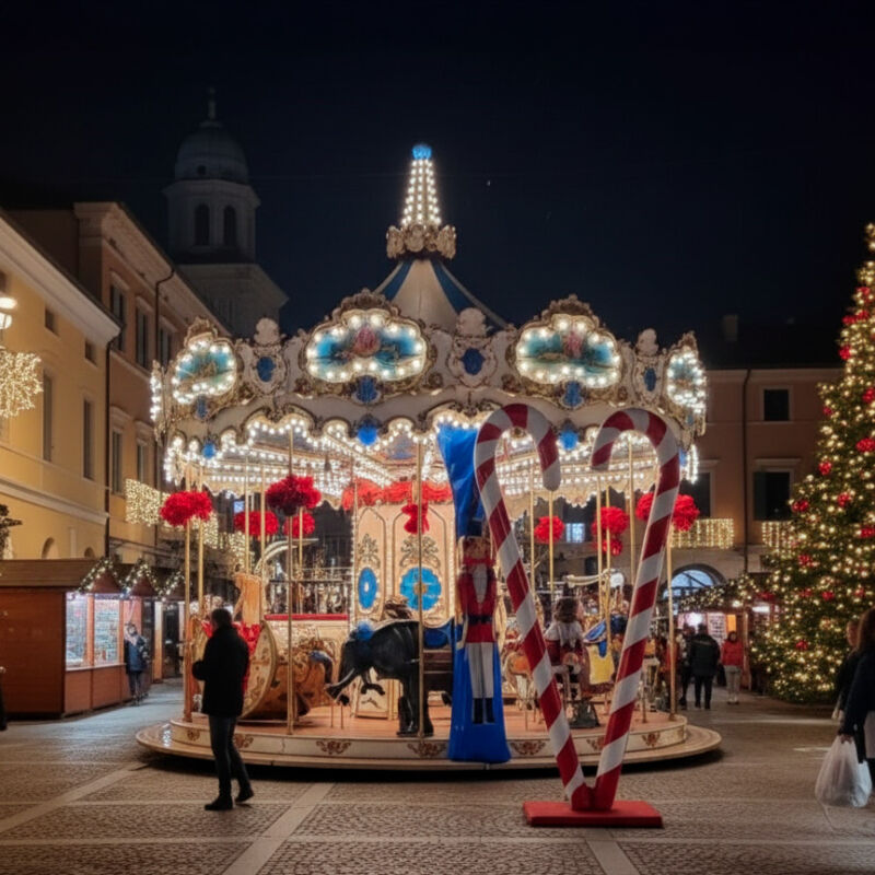 Struttura elegante in stile tradizionale, con luci, colori e cavallini decorati che richiamano le giostre storiche dei parchi cittadini.