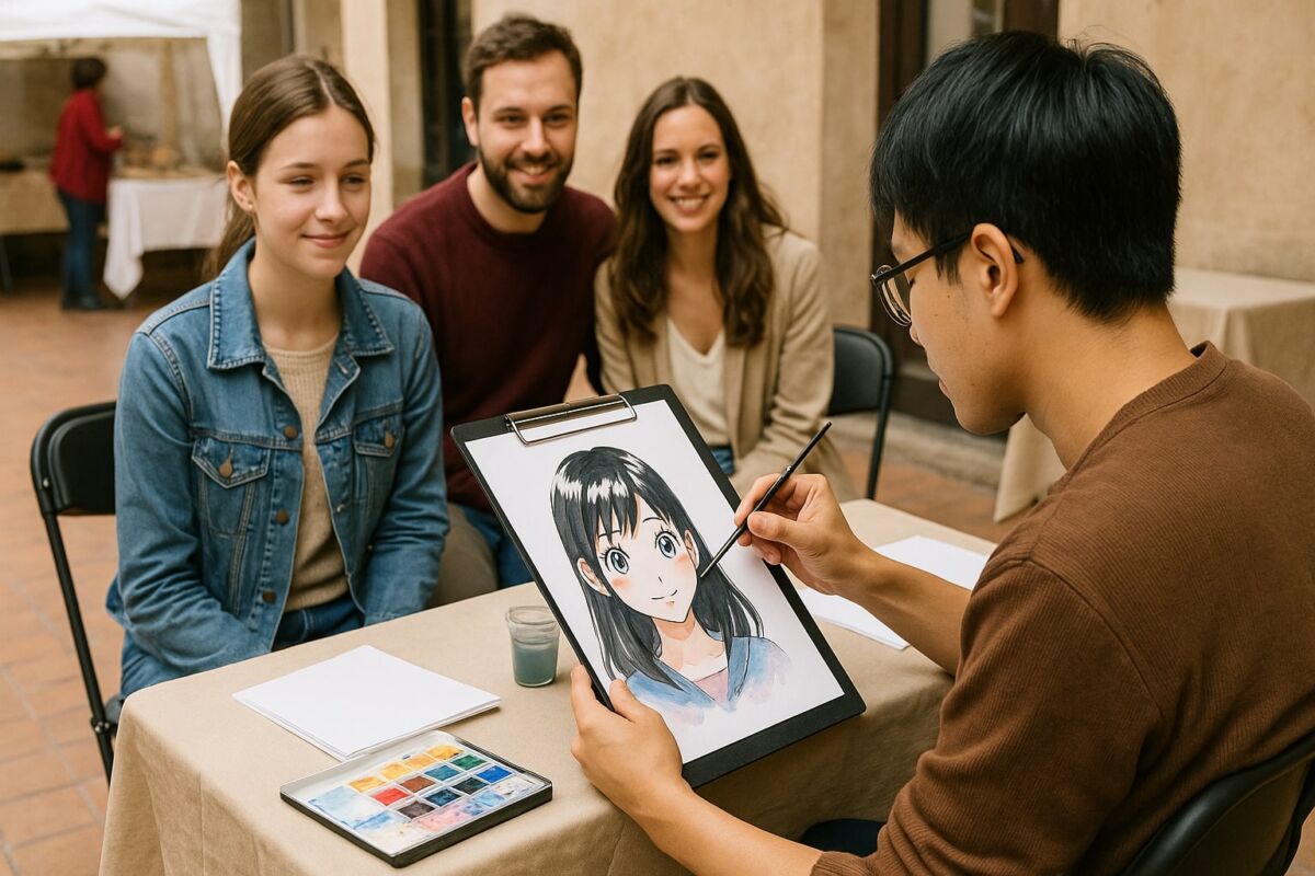 L’artista realizza ritratti personalizzati in stile manga, dipinti ad acquerello su fogli formato A4. Ogni opera viene creata in pochi minuti, direttamente davanti agli ospiti, che possono così assistere all’intero processo creativo.