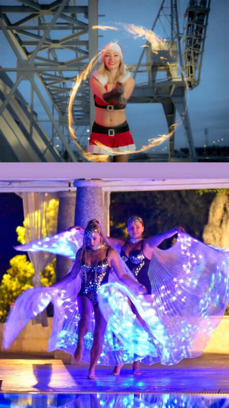 Gli artisti si esibiscono con ali luminose, attrezzi LED e costumi natalizi scintillanti, creando un’atmosfera incantata perfetta per ogni evento di Natale.