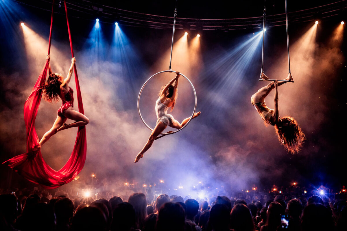 Lo spettacolo si sviluppa in una sequenza dinamica di performance aeree che alternano momenti di intensa energia ad attimi di pura armonia. Ogni disciplina racconta una storia attraverso il movimento: