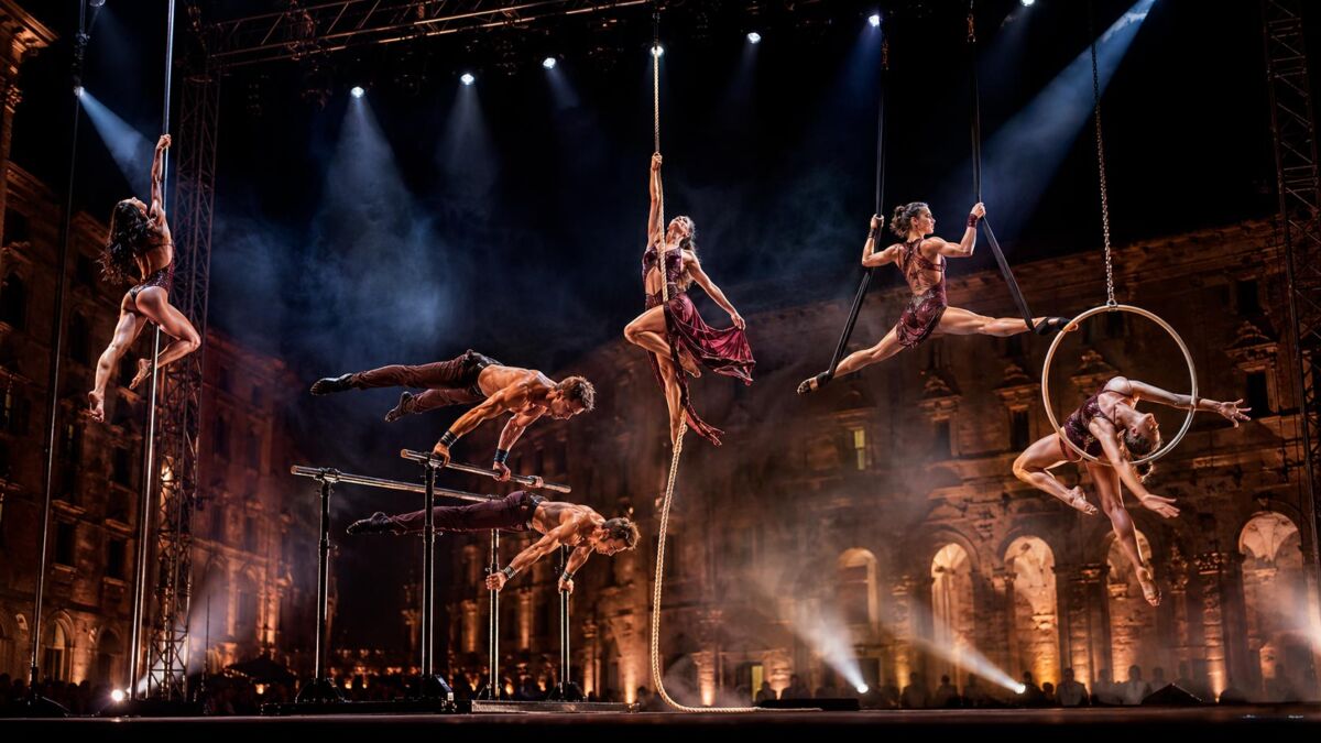 La corda introduce una dimensione aerea intensa e suggestiva, con salite, cadute controllate, rotazioni e posizioni sospese che catturano immediatamente lo sguardo. Gli strap, grazie alla loro essenzialità scenica, permettono movimenti fluidi e potenti, esaltando la fisicità degli artisti e creando un effetto visivo di grande eleganza. Il cerchio aereo, infine, regala momenti poetici e raffinati, con figure circolari, sospensioni e coreografie che rendono lo show particolarmente emozionante.