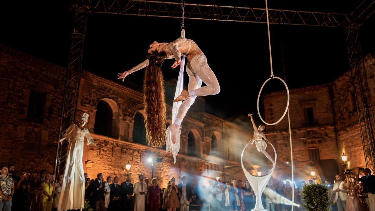 Il cerchio aereo completa la performance con eleganza e armonia. Le figure realizzate sul cerchio creano immagini raffinate, perfette per contesti eleganti come matrimoni, cene spettacolo ed eventi aziendali, ma anche per sagre e feste di paese dove si vuole offrire un momento visivo di grande richiamo.
