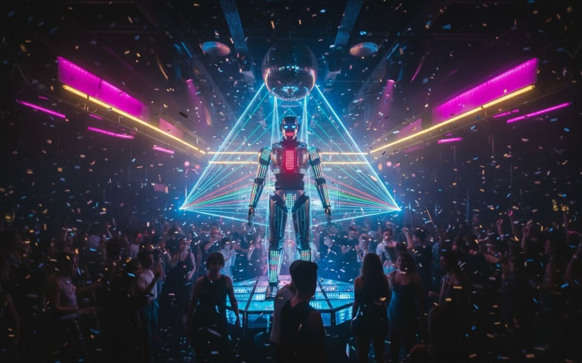 Lo spettacolo prevede la presenza di un grande robot luminoso dotato di led programmabili, laser e dettagli scenici che creano un effetto visivo straordinario. Il performer, all’interno della struttura robotica, interagisce con il pubblico attraverso coreografie dinamiche, giochi di luce e momenti di animazione diretta: dalle pose sceniche per le foto alla partecipazione attiva con gli ospiti, fino a interventi energici sulla musica.