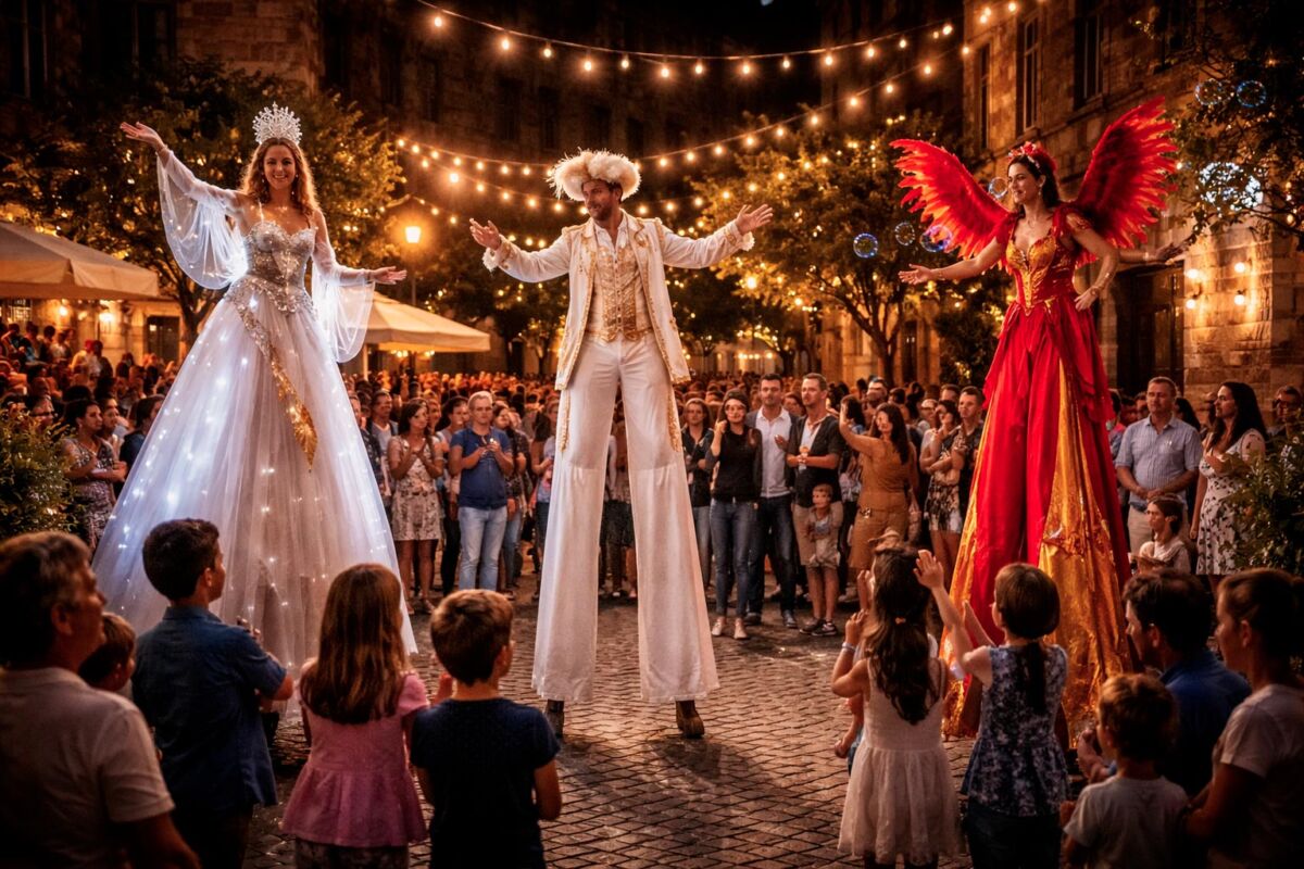L’animazione sui trampoli non è solo una performance, ma una vera esperienza immersiva. Gli artisti, con costumi scenografici e movimenti eleganti, si muovono tra gli ospiti coinvolgendoli in modo naturale e spontaneo.
