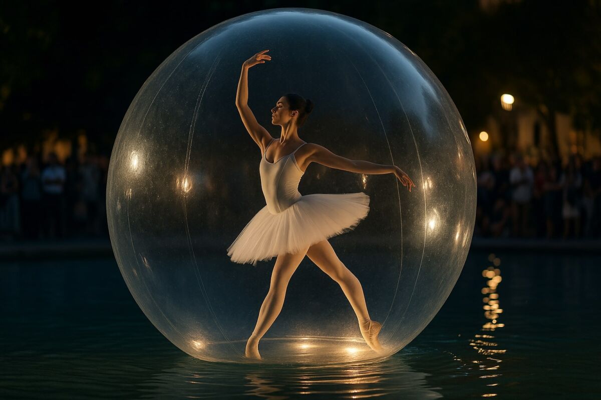 Lo spettacolo “Ballerina nella sfera” è una delle performance più affascinanti e scenografiche nel mondo degli eventi. L’artista, una ballerina professionista, danza all’interno di una grande sfera trasparente che può galleggiare sull’acqua o posarsi a terra, creando un effetto visivo incantevole e onirico.