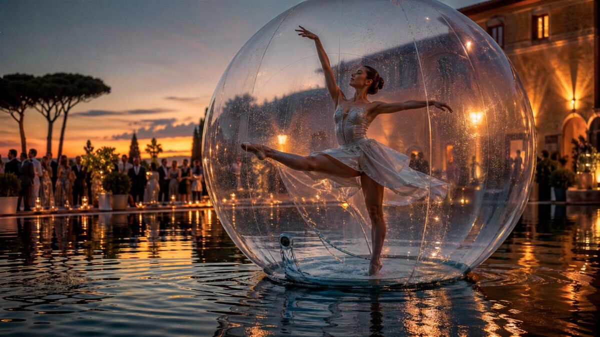 La water ball diventa un palcoscenico sospeso sull’acqua, capace di unire danza, movimento, leggerezza e meraviglia. La performer, attraverso movimenti armoniosi e pose coreografiche, dà vita a una performance raffinata che cattura lo sguardo degli ospiti e trasforma l’atmosfera dell’evento in qualcosa di magico.