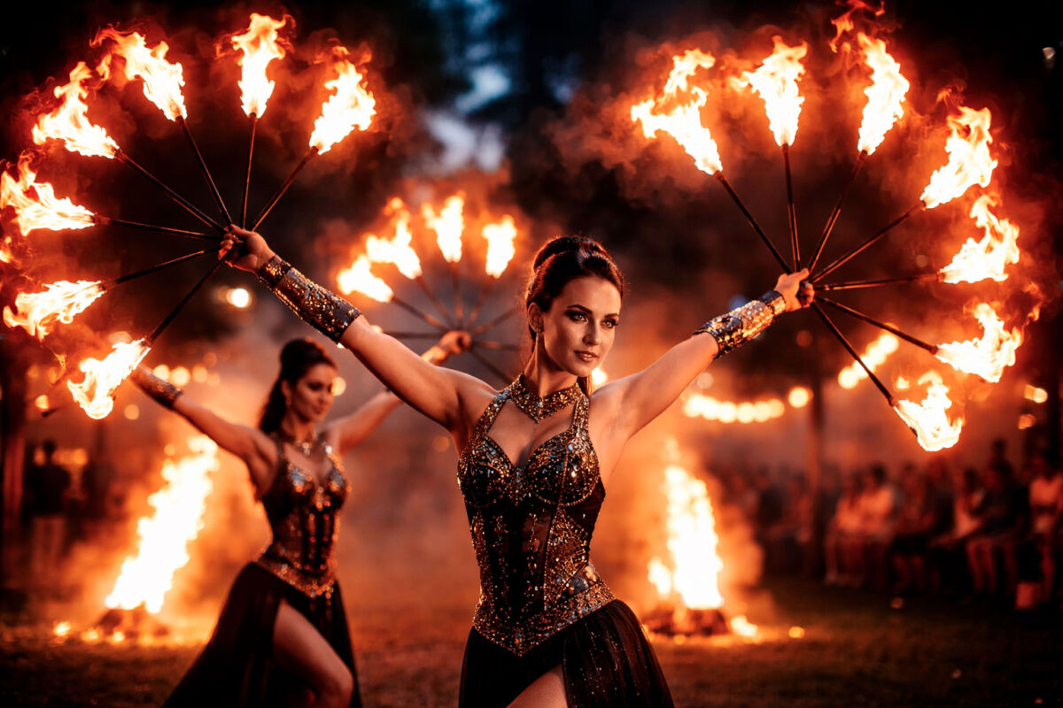 Uno spettacolo con ventagli di fuoco è una performance visiva di grande impatto, capace di trasformare qualsiasi evento in un’esperienza memorabile. Il movimento armonico delle fiamme, guidato da artisti professionisti, crea coreografie eleganti e potenti che catturano l’attenzione del pubblico fin dal primo istante. È una proposta scenografica raffinata, intensa ed emozionante, perfetta per chi desidera distinguersi con uno show originale e suggestivo.