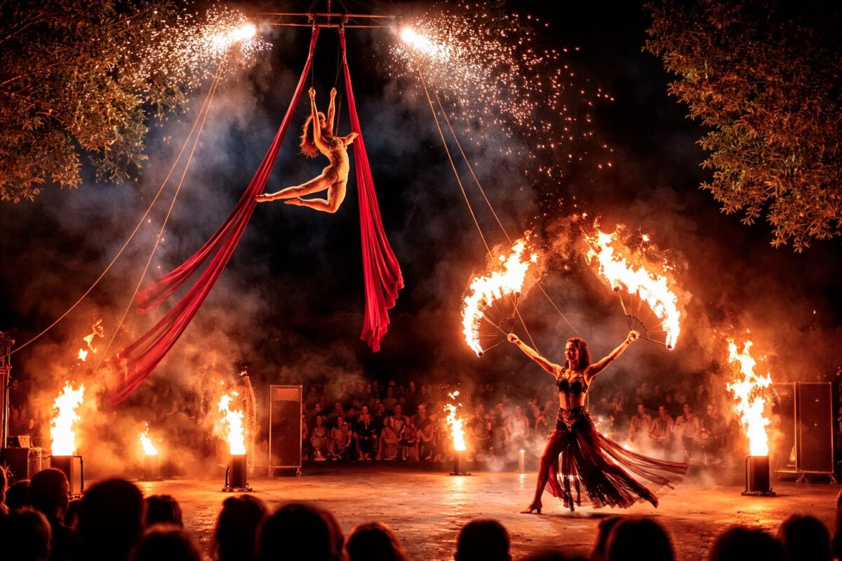 show di fuoco: il ritmo si accende con performance spettacolari che utilizzano il fuoco come elemento scenico principale. Fiamme, giochi luminosi e movimenti sincronizzati generano un’esperienza intensa e coinvolgente.