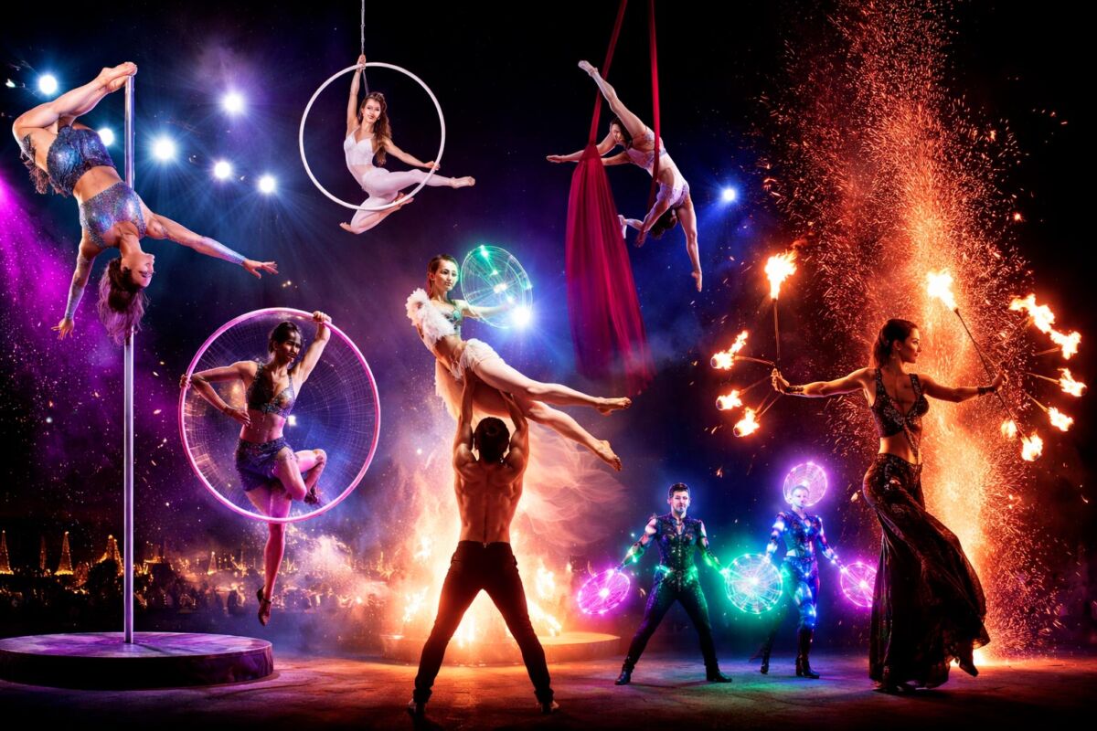 Una variante scenografica della pole dance, caratterizzata da una struttura circolare che amplifica l’effetto visivo e dona allo spettacolo un’estetica moderna e originale.