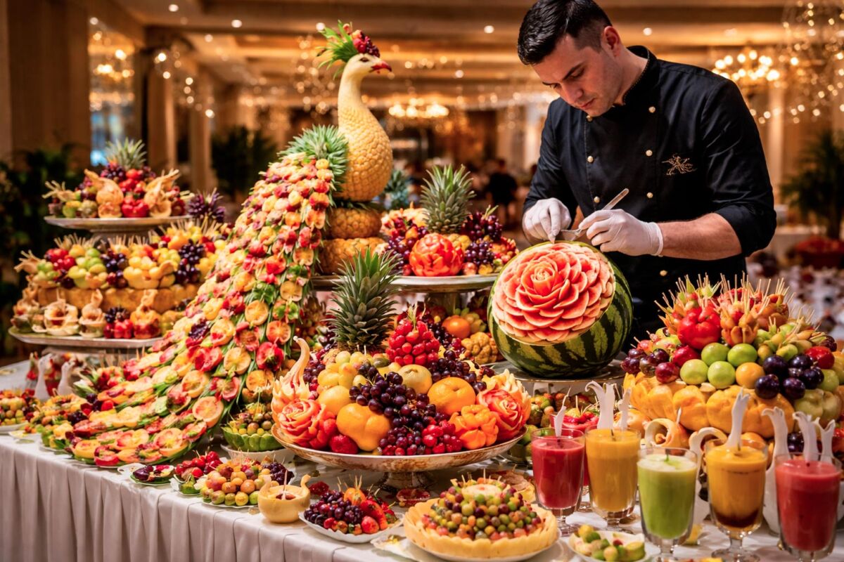 Al centro della scena c’è un maestro della lavorazione artistica della frutta, specializzato in fruit carving e nella creazione di vere e proprie installazioni visive. Con abilità, precisione e creatività, trasforma la materia prima in opere spettacolari, rendendo la frutta protagonista assoluta.