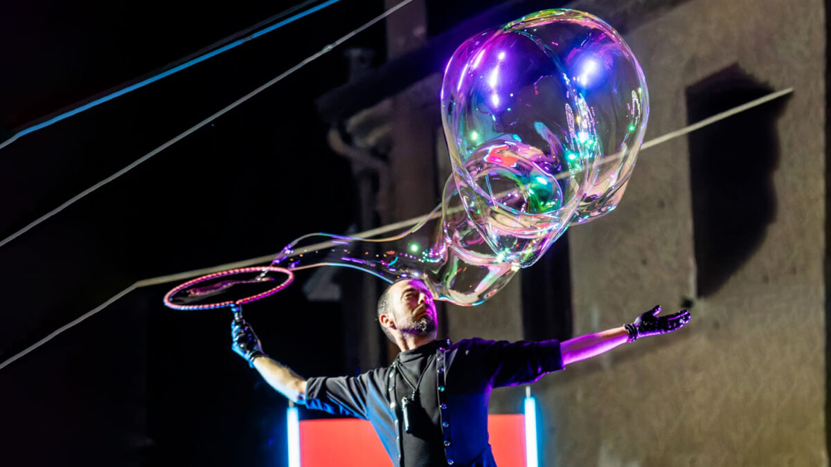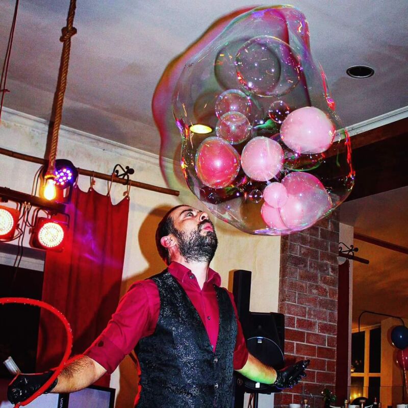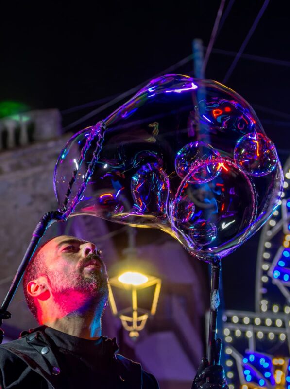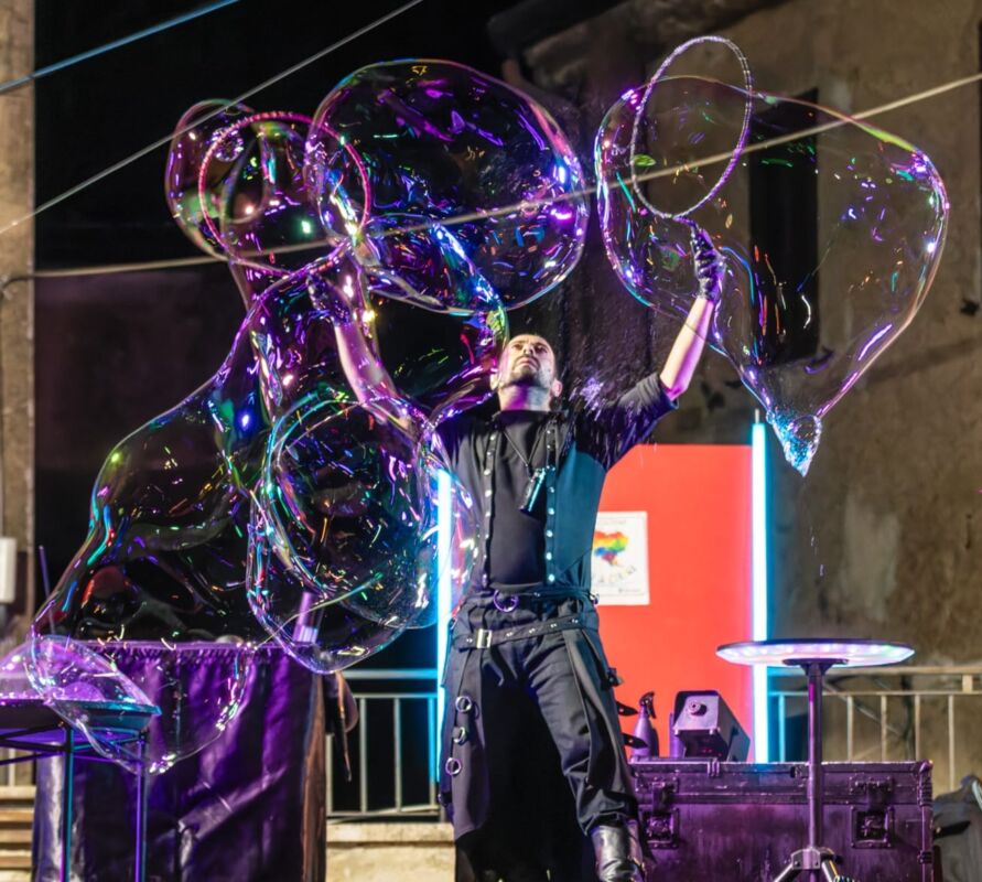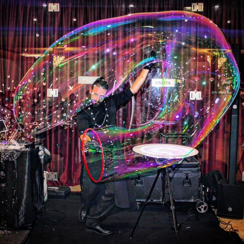 Le bolle di sapone giganti, le scie luminose e gli effetti speciali creano un’atmosfera suggestiva e coinvolgente. La performance unisce abilità artistica, musica ed effetti visivi, trasformando qualsiasi location in un’esperienza indimenticabile.