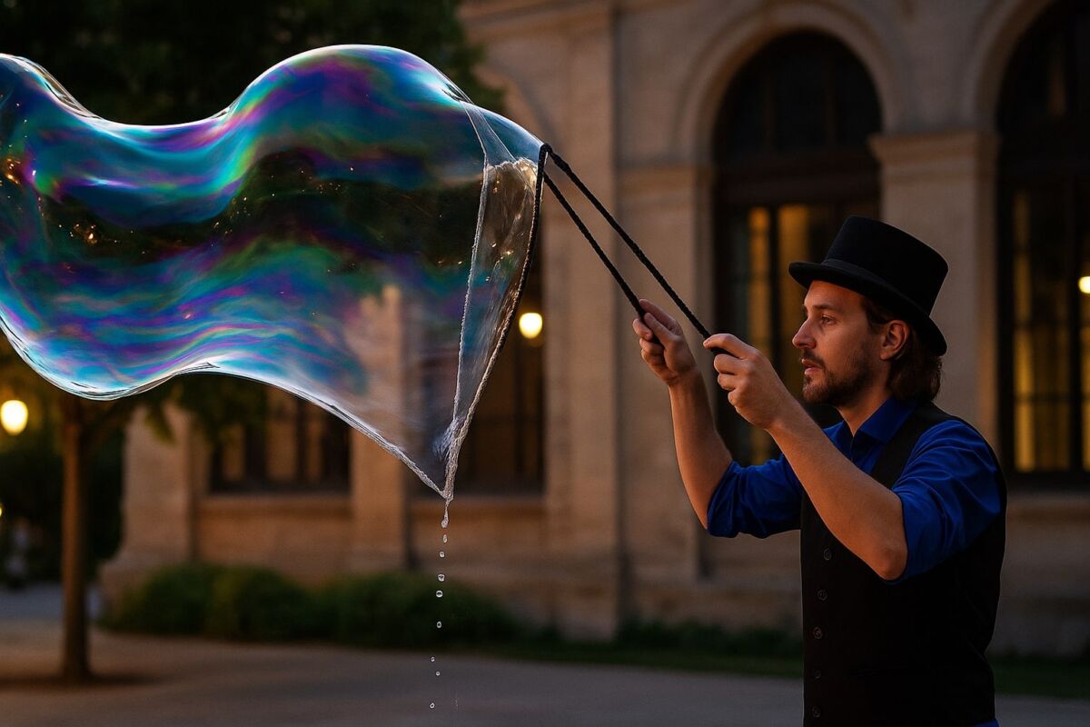 Lo spettacolo di bolle giganti è una performance che trasforma l’aria in poesia, unendo arte, colore e meraviglia in un’esperienza unica e affascinante. Le bolle di sapone diventano protagoniste assolute di uno spettacolo capace di stupire grandi e piccoli, grazie a giochi di luce, musica e coreografie che creano un’atmosfera fiabesca e coinvolgente.