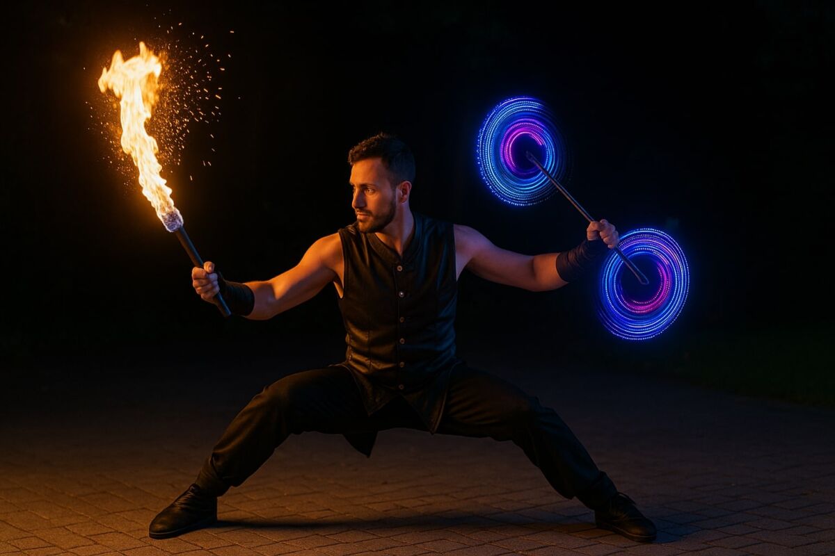 Lo spettacolo di fuoco e led è una performance di grande impatto visivo ed emozionale, capace di trasformare qualsiasi evento in un momento indimenticabile. Unisce due arti affascinanti: il fire show, con coreografie spettacolari e fiamme danzanti, e il led show, dove luci colorate e giochi luminosi creano atmosfere futuristiche e suggestive.