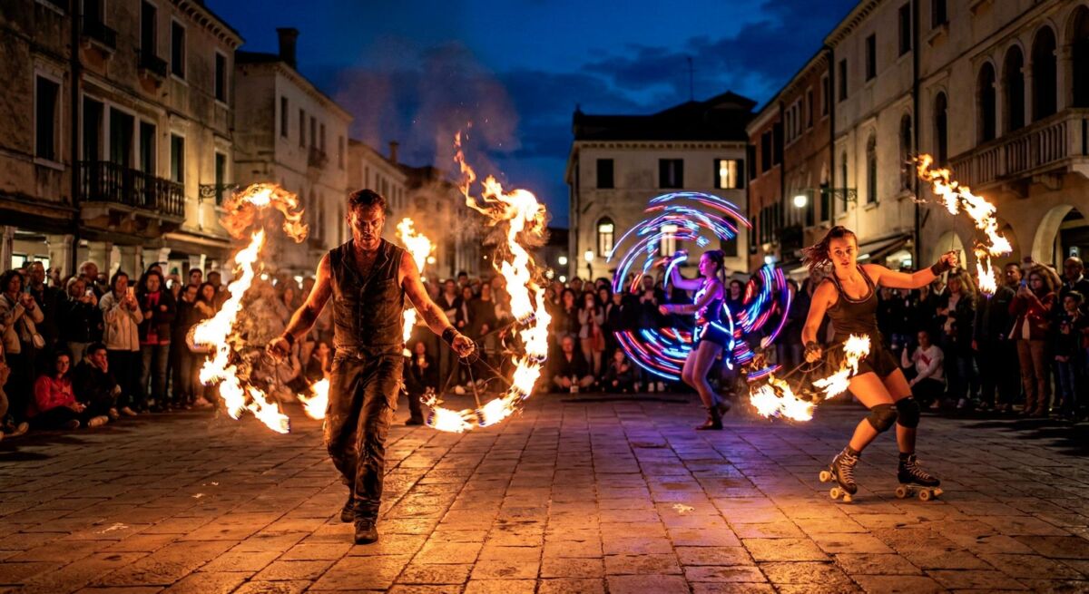 Nel fire show, il fuoco diventa protagonista assoluto: fiamme vive danzano nello spazio, creando giochi di luce caldi e magnetici. Gli artisti utilizzano strumenti scenici come bolas, torce e ventagli infuocati, eseguendo coreografie fluide e spettacolari che catturano lo sguardo e trasmettono energia pura.