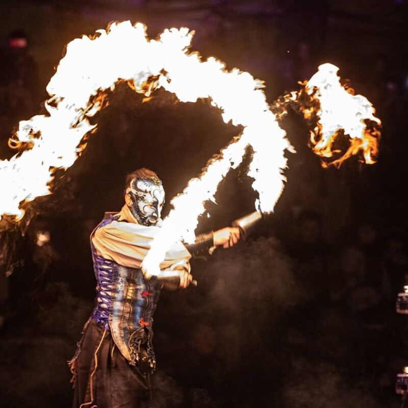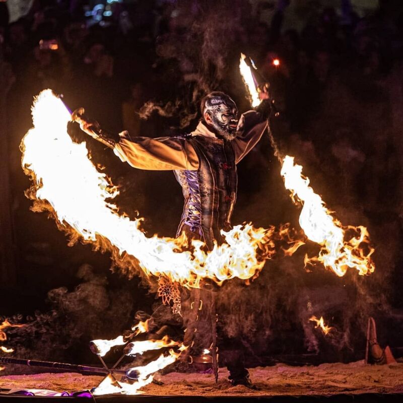 Una vera e propria favola prende forma attraverso la danza con il fuoco, dove ogni movimento racconta una storia e ogni fiamma diventa linguaggio. Il pubblico viene accompagnato in una dimensione fantastica e onirica, dove il fuoco non è solo elemento scenico, ma protagonista assoluto: energia viva, simbolo di trasformazione, poesia visiva che crea connessione tra artista e spettatori.