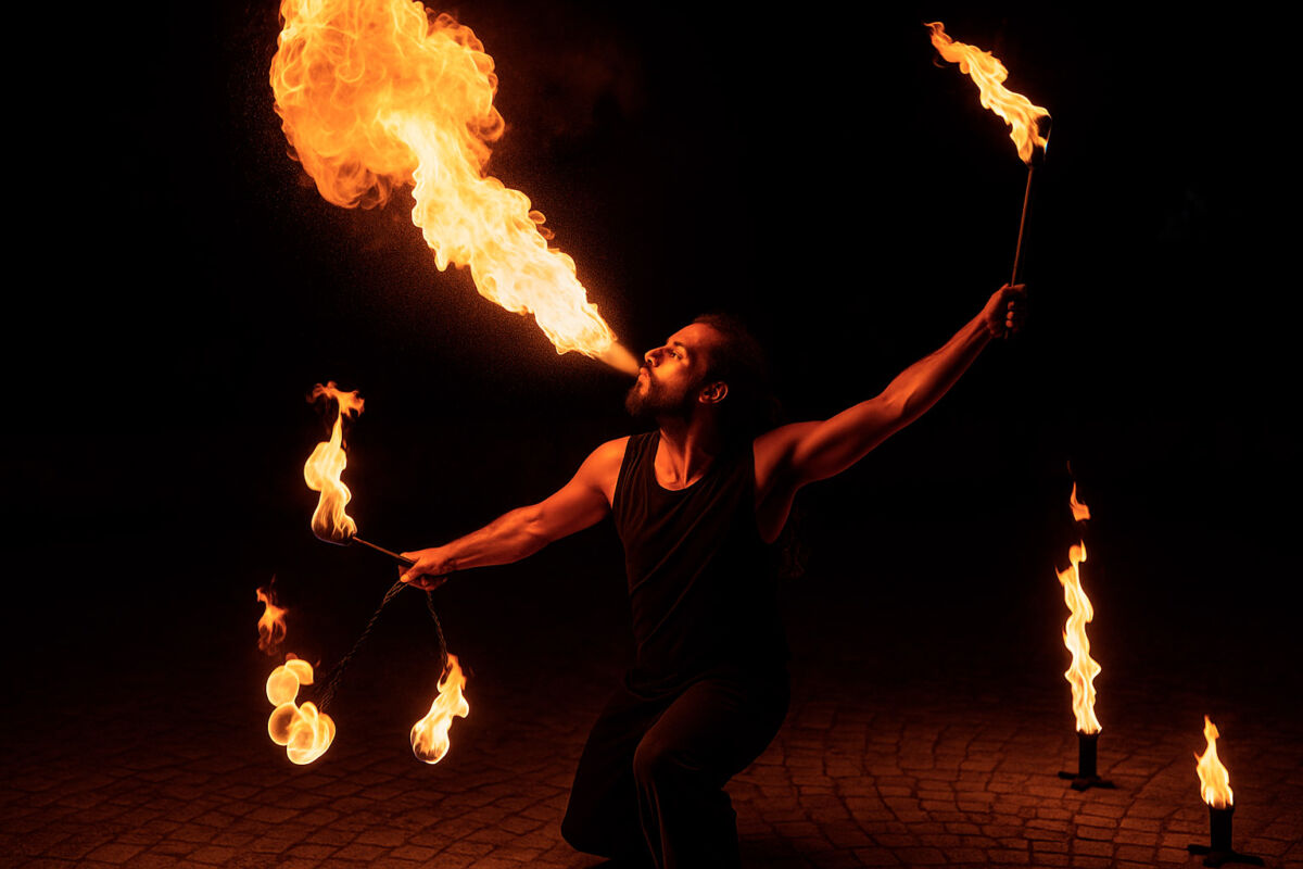 Una delle esibizioni più iconiche del mondo del fuoco. L’artista crea enormi fiammate in un’esplosione controllata di luce e calore, lasciando gli spettatori senza fiato.