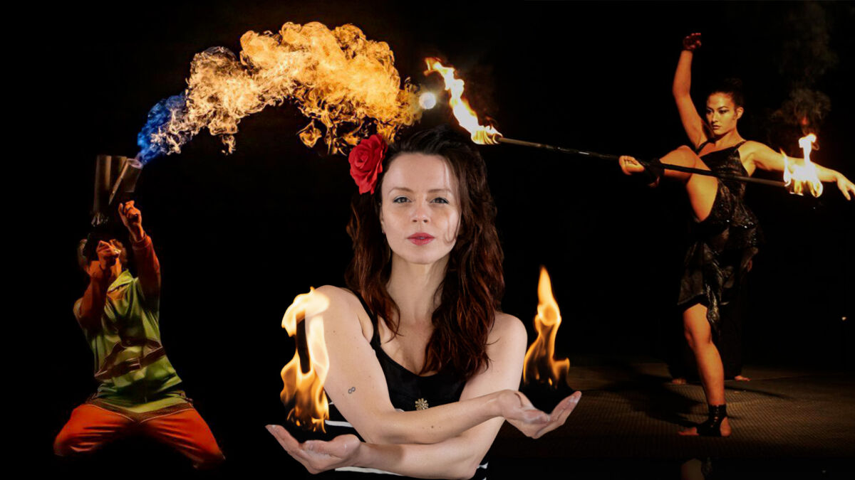 La performer esegue numeri di grande precisione e bellezza con una vasta gamma di attrezzi infuocati: