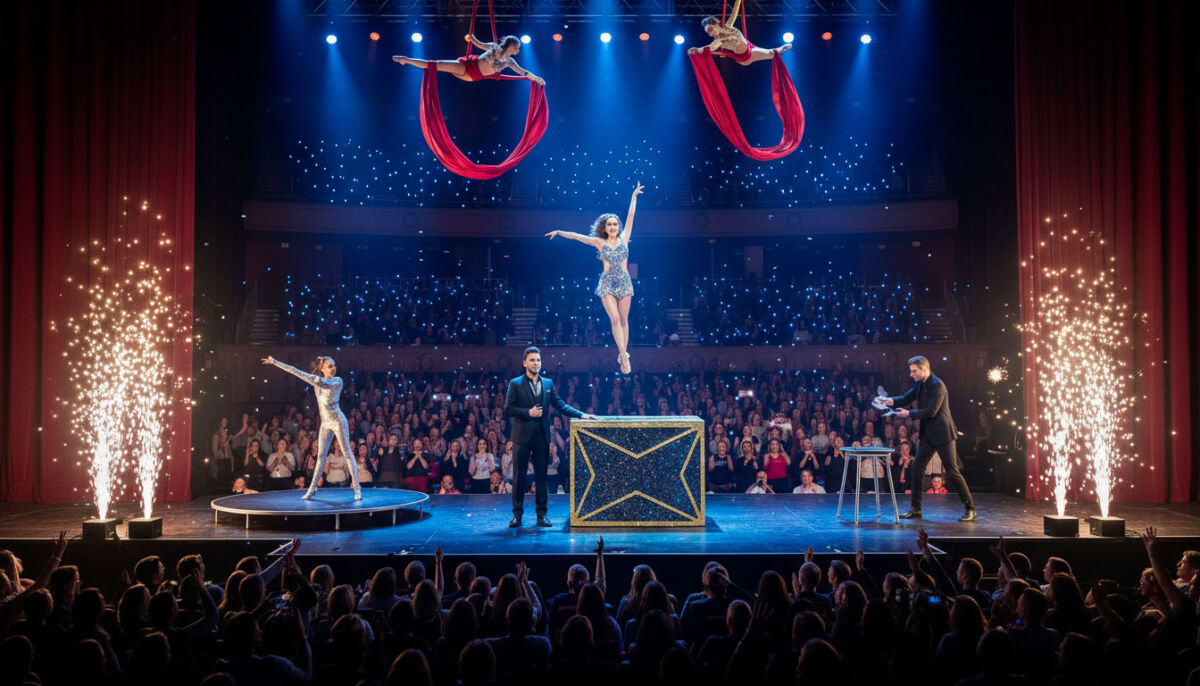 Questo show unisce discipline diverse in un’unica narrazione scenica, pensata per tenere viva l’attenzione e incrementare il senso di meraviglia minuto dopo minuto.