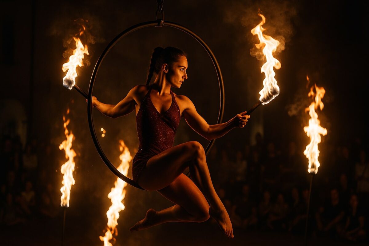 Lo spettacolo di giocoleria acrobatica con cerchio e fuoco è un’esplosione di energia e fascino visivo, capace di conquistare ogni tipo di pubblico. L’artista unisce con maestria acrobatica aerea, manipolazione del fuoco e momenti di giocoleria interattiva, creando una performance unica nel suo genere.