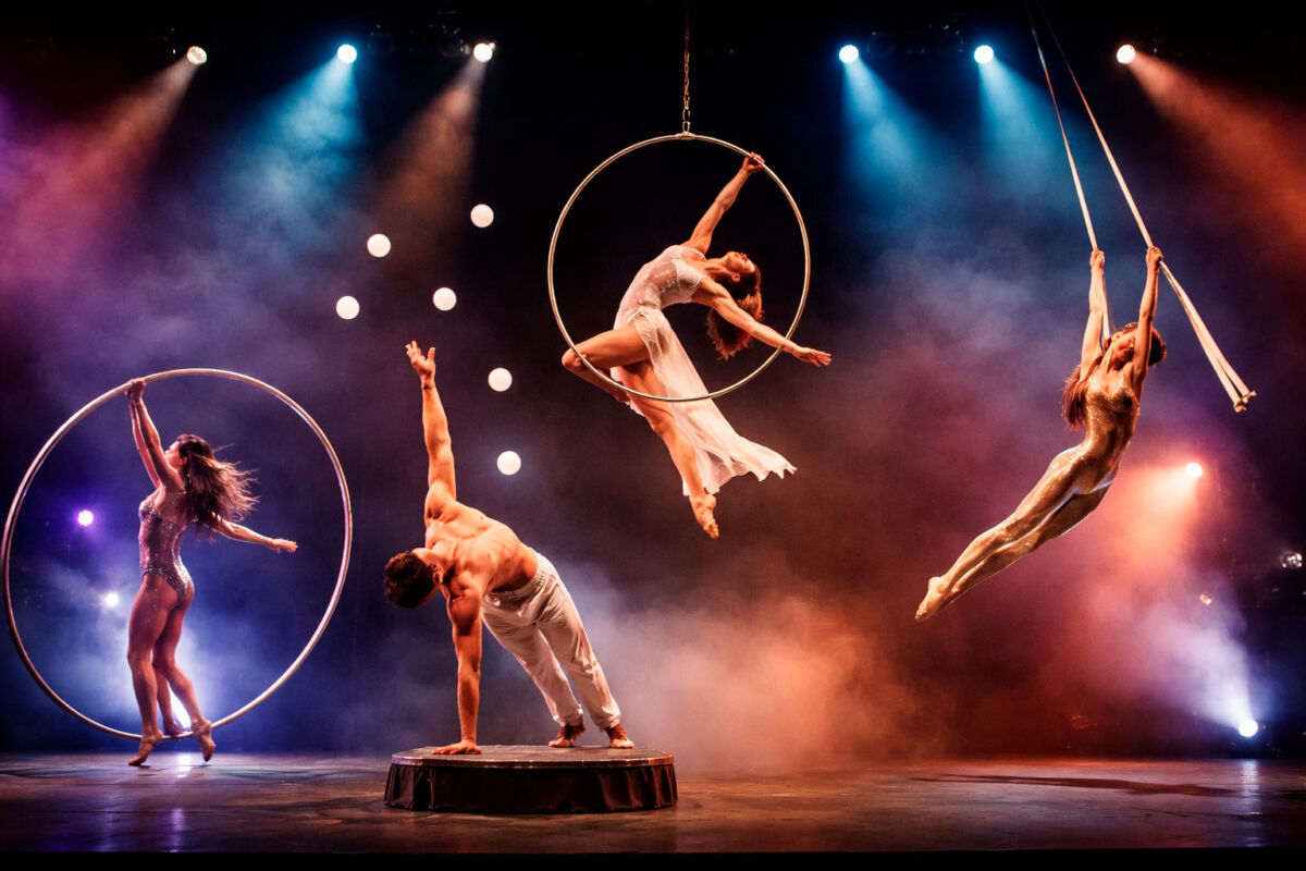 Grazie alla combinazione di verticale con palline, ruota cyr, cerchio aereo e cinghie aeree, lo show alterna momenti di pura poesia a passaggi dinamici e spettacolari, mantenendo alta l’attenzione dall’inizio alla fine.