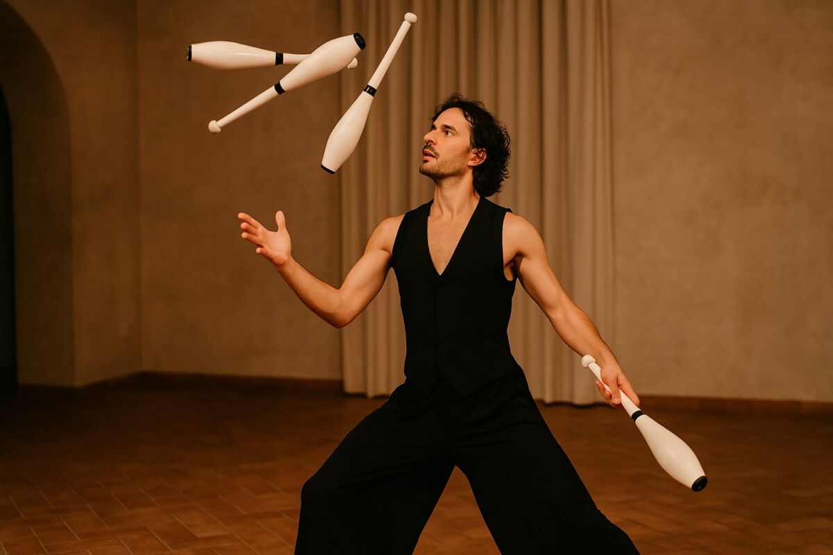 La giocoleria in danza è molto più di un semplice numero di abilità: si tratta di uno spettacolo che racconta attraverso il corpo, i gesti e gli oggetti. Palline, clave, cerchi e altri attrezzi diventano estensioni del movimento, dando vita a figure armoniche e sequenze spettacolari.
