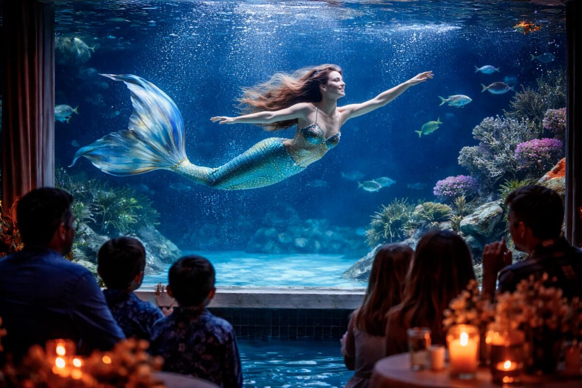 Lo spettacolo sirena è una performance artistica acquatica in cui un’interprete professionista, vestita da sirena con una coda realistica e scenografica, si esibisce all’interno di piscine o acquario. I movimenti fluidi, l’eleganza dei gesti e la perfetta sintonia con l’acqua creano un effetto visivo suggestivo e quasi fiabesco.