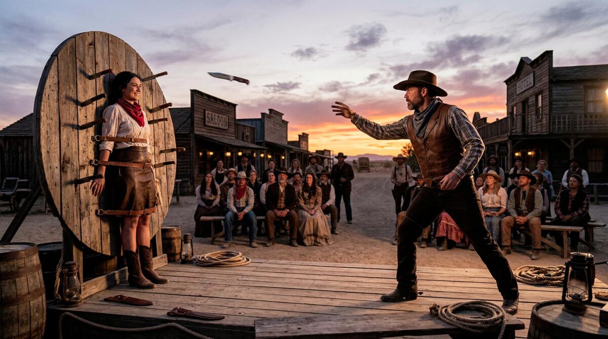 Atmosfere polverose, tensione crescente e adrenalina pura: lo spettacolo tema western con lancio di coltelli è una performance intensa e spettacolare che trasporta il pubblico direttamente nel cuore del Far West.