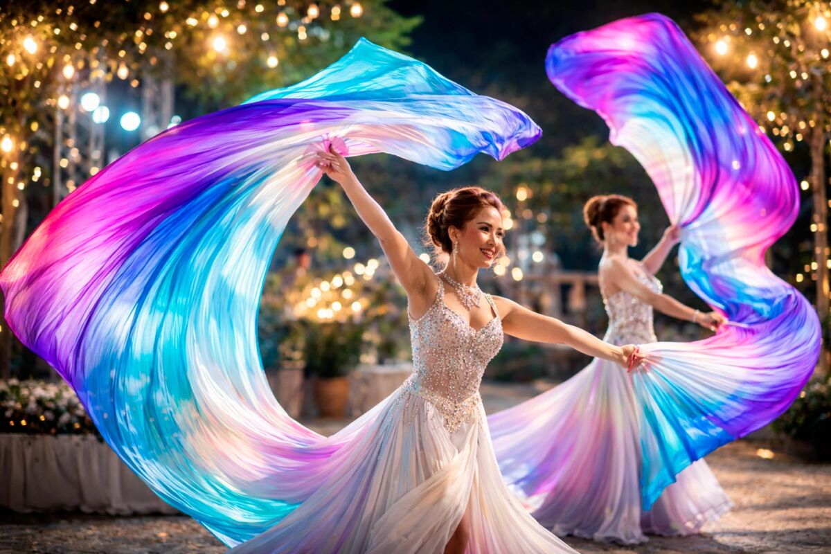 Proposto dall’agenzia Spettacoli Eventi, questo numero artistico unisce danza, movimento armonico e scenografie dinamiche create da ampi ventagli in seta, che si aprono e si muovono nell’aria come onde leggere e colorate. Un’esperienza breve ma intensa, in grado di catturare l’attenzione fin dal primo istante.